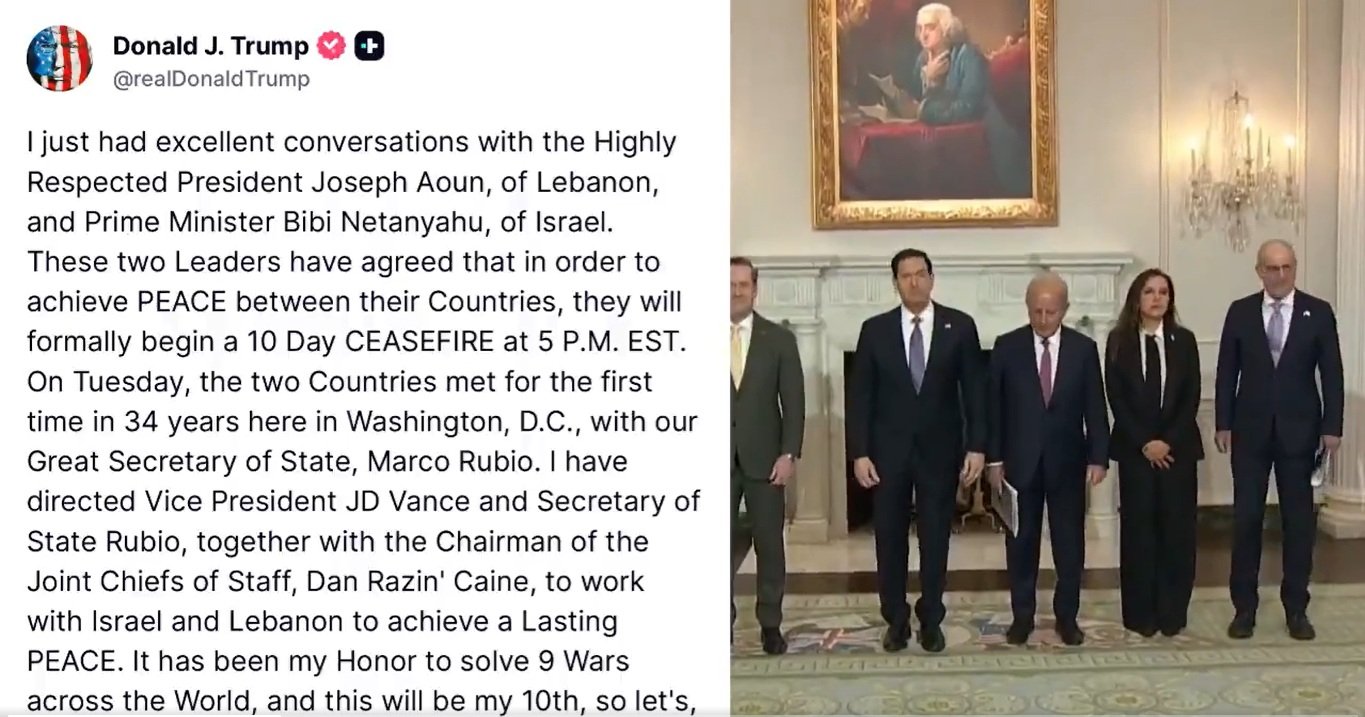 अमरीका के राष्ट्रपति डॉनल्ड ट्रम्प ने इस्राएल और लेबनान के बीच 10 दिनों के युद्धविराम की घोषणा की। डॉनल्ड ट्रम्प ने लेबनान के राष्ट्रपति जोसेफ औन और इस्राएल के प्रधानमंत्री बेंजामिन नेतन्याहू के साथ हुई बातचीत को सकारात्मक बताया। उन्होंने कहा कि दोनों नेता शांति की राह पर चलने के लिए युद्धविराम पर सहमत हुए।