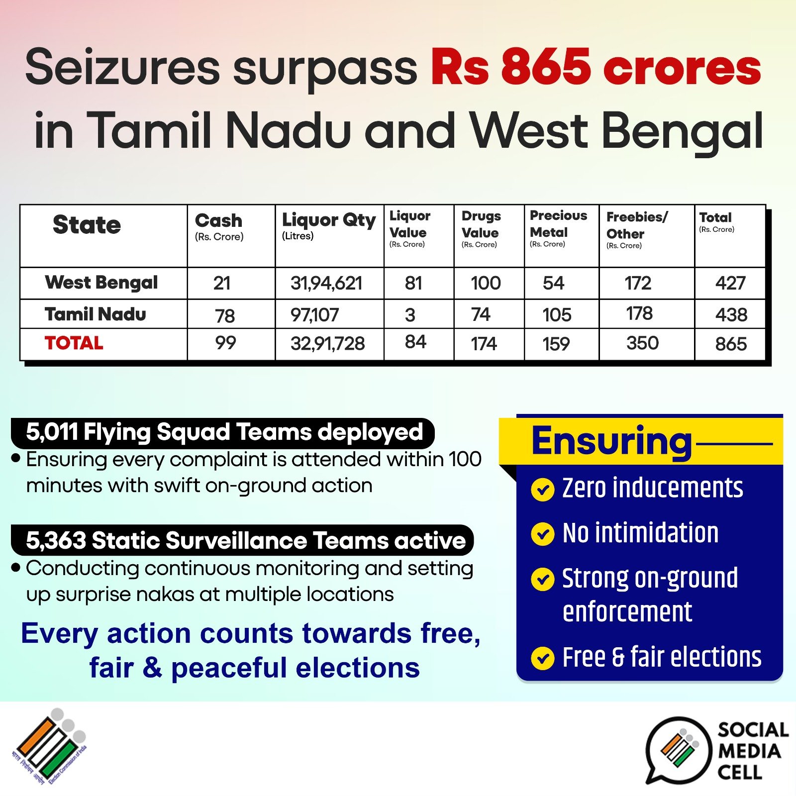 निर्वाचन आयोग ने विधानसभा चुनाव से पहले तमिलनाडु और पश्चिम बंगाल में 865 करोड़ रुपये से अधिक की जब्ती की है। आयोग ने बताया कि 26 फरवरी को चुनाव जब्ती प्रबंधन प्रणाली के लागू होने के बाद से पश्चिम बंगाल में नकदी, शराब, मादक पदार्थों, कीमती धातुओं और मुफ्त उपहारों सहित 427 करोड़ रुपये और तमिलनाडु में इसी श्रेणी में 438 करोड़ रुपये की जब्ती हुई है।