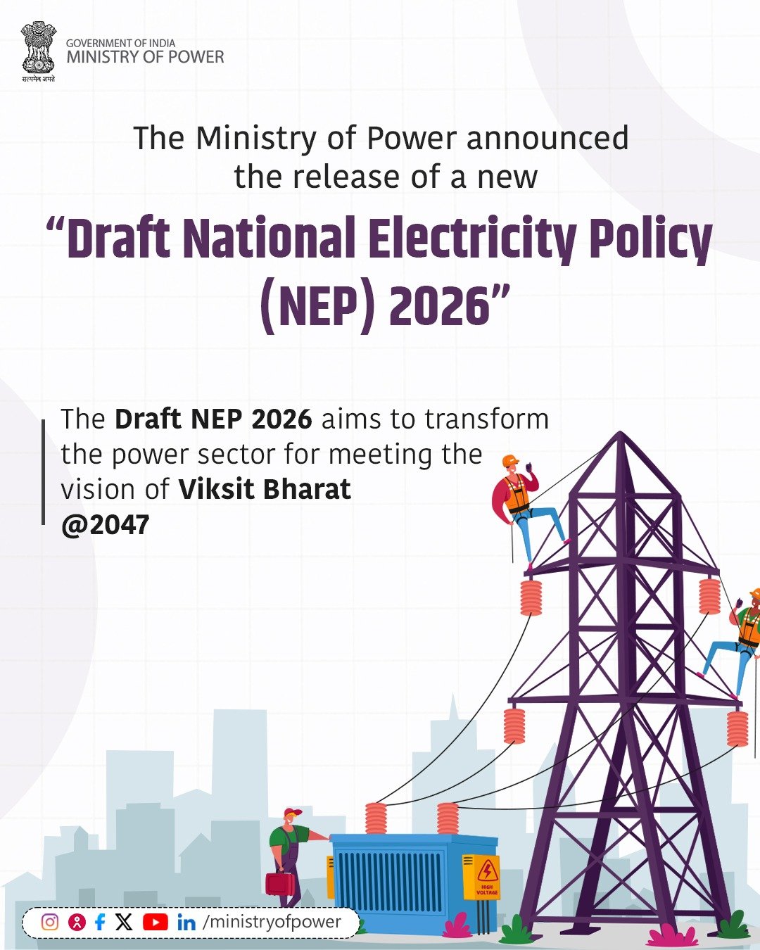विद्युत मंत्रालय ने नई "राष्ट्रीय विद्युत नीति (एनईपी) 2026" का मसौदा जारी करने की घोषणा की है। इस मसौदा एनईपी…
