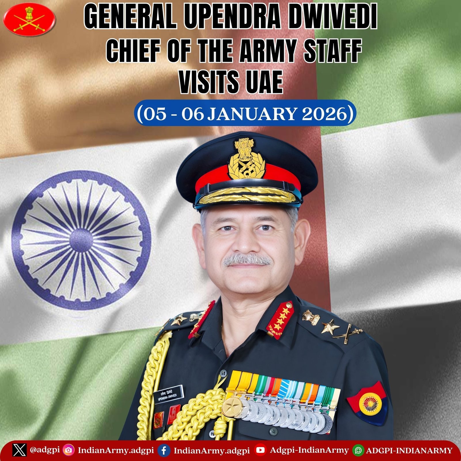 सेना प्रमुख (सीओएएस), जनरल उपेंद्र द्विवेदी, विदेशी मित्र राष्ट्रों के साथ रक्षा सहयोग एवं सैन्य संबंधों को मजबूत करने की भारत की निरंतर प्रतिबद्धता के मद्देनजर 05 से 08 जनवरी 2026 तक संयुक्त अरब अमीरात एवं श्रीलंका की यात्रा पर रवाना हुए।