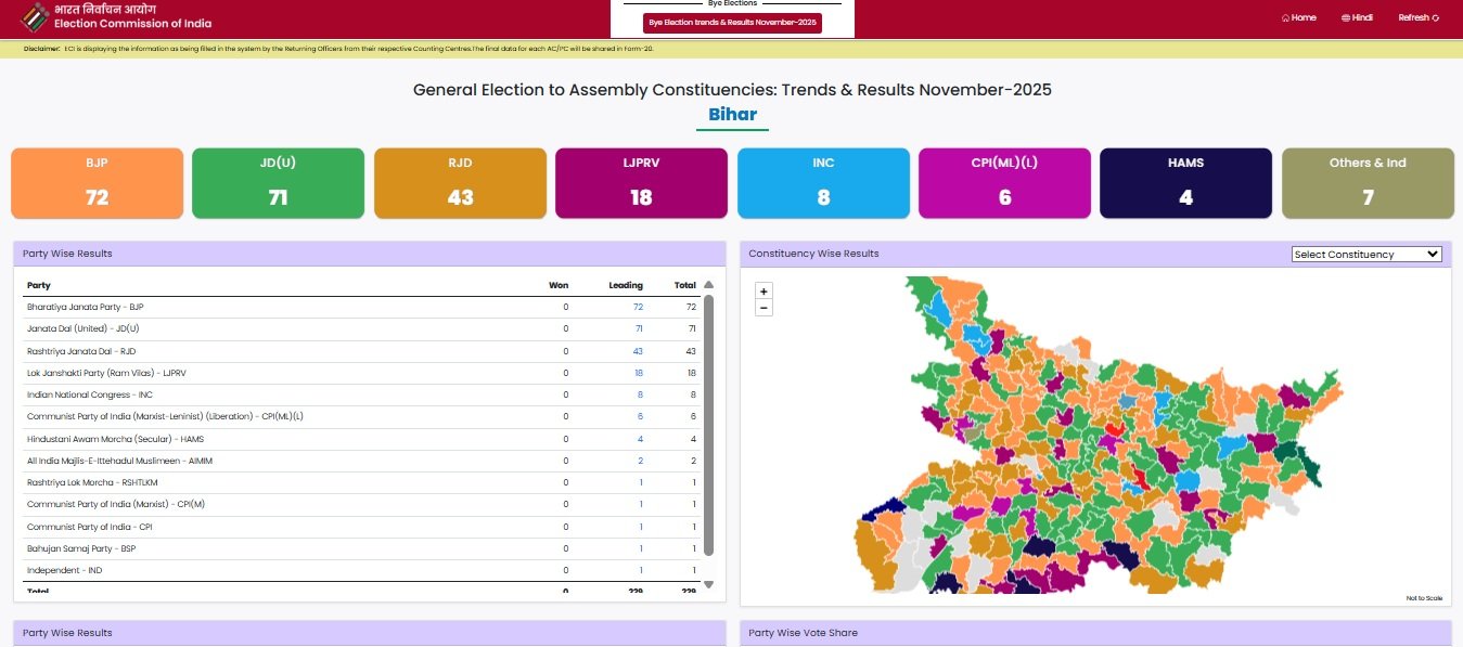 बिहार विधानसभा चुनाव: चुनाव आयोग के शुरुआती रुझानों के अनुसार, NDA 111 सीटों (भाजपा 48, जदयू 47, लोजपा 13, HAMS 3) पर आगे चल रही है और महागठबंधन 31 सीटों (राजद 23, कांग्रेस 7, वीआईपी 1) पर आगे चल रही है। अन्य और निर्दलीय 5 सीटों पर आगे चल रहे हैं।