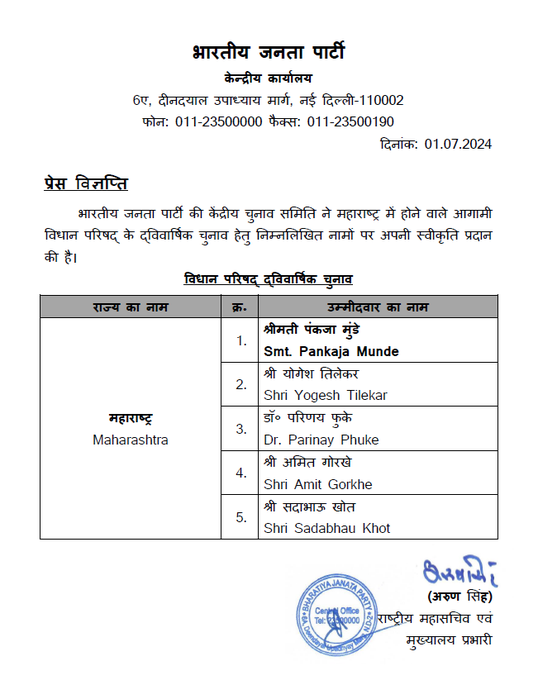 भाजपा ने महाराष्ट्र विधान परिषद द्विवार्षिक चुनाव के लिए उम्मीदवारों के नामों की घोषणा की। पंकजा मुंडे को MLC चुनाव के लिए पार्टी का उम्मीदवार घोषित किया गया।