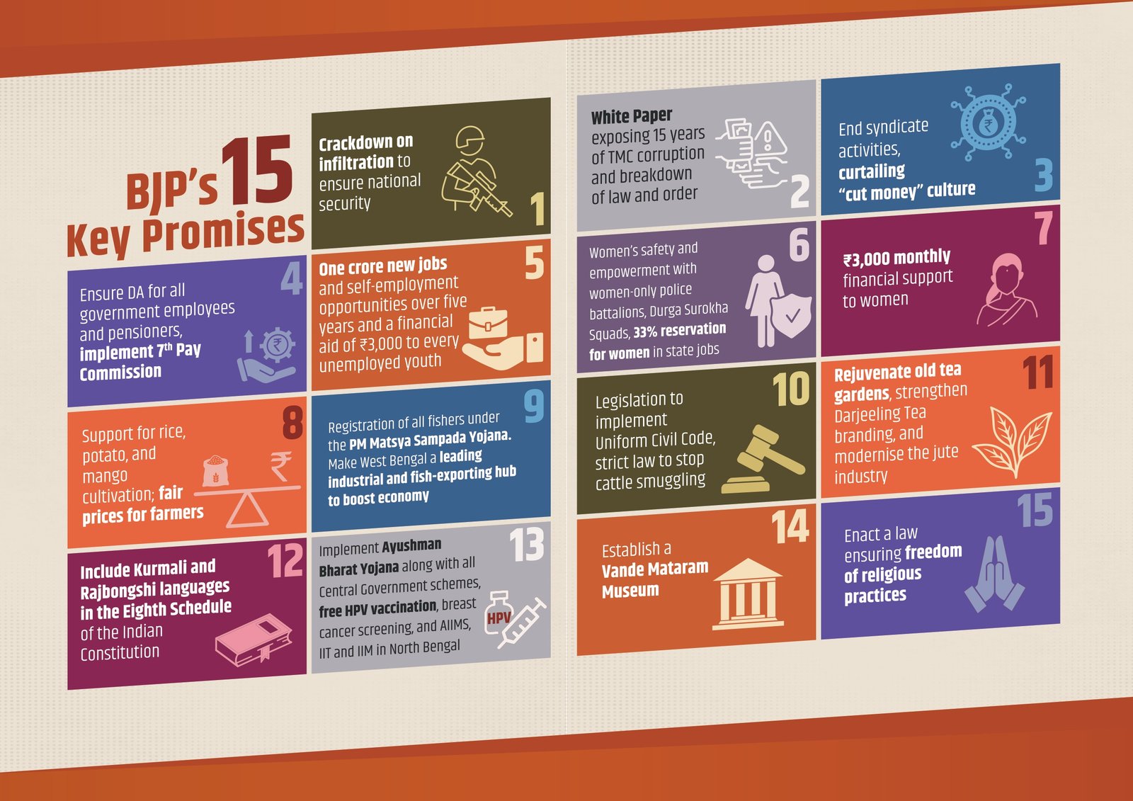 यह संकल्प पत्र बंगाल के हर तपके में व्याप्त गहरी निराशा से बाहर निकलने का एक मार्ग है। इस संकल्प पत्र के अंदर कृषि बर्बाद होने से कई प्रकार की आशंकाओं से घिरे किसान को एक नया मार्ग दिखाएगा। बंगाल की संस्कृति के ह्रास से चिंतित बंगाल संस्कृति के गौरव की अनुभूति करने वाले हर नागरिक को एक नई आशा और नया भरोसा देगा।