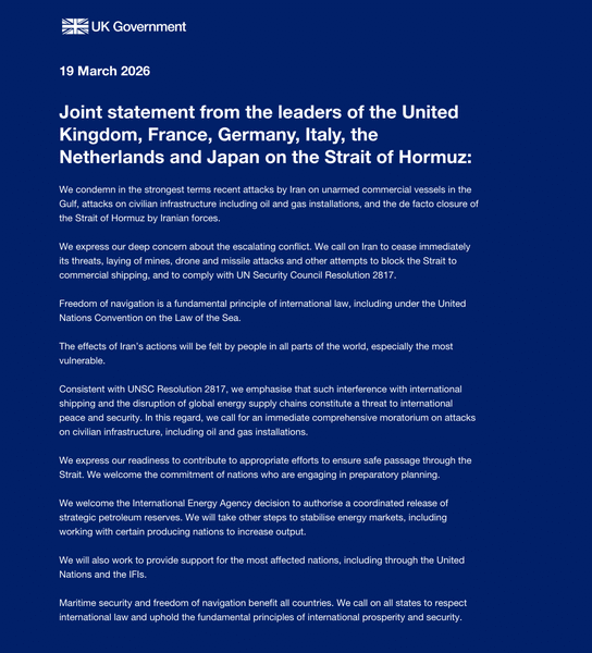 ब्रिटेन के प्रधानमंत्री कीर स्टार्मर के कार्यालय की ओर से जारी संयुक्त बयान में, इन देशों ने ईरान के हमलों की कड़ी निंदा की और उससे तुरंत कार्रवाई रोकने को कहा है। उन्होंने ईरान से अपील की कि वह होर्मुज जलडमरूमध्य को व्यापारिक जहाजों के लिए बंद करने की धमकी देना, बारूदी सुरंग बिछाना तथा ड्रोन और मिसाइल हमले तुरंत बंद करे।