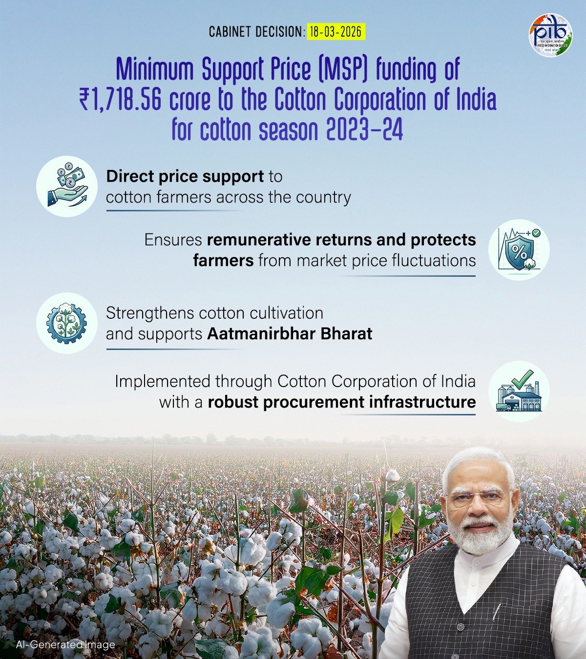 किसान कल्याण को सुदृढ़ करने और आत्मनिर्भर भारत के विजन को आगे बढ़ाने की दिशा में एक महत्वपूर्ण कदम उठाते हुए, प्रधानमंत्री नरेन्द्र मोदी की अध्यक्षता वाली आर्थिक मामलों की मंत्रिमंडलीय समिति ने कपास के 2023-24 सीजन के लिए भारतीय कपास निगम (सीसीआई) को न्यूनतम समर्थन मूल्य (एमएसपी) के रूप में 1,718.56 करोड़ रुपये की धनराशि स्वीकृत की है। इस धनराशि का उद्देश्य देश भर के कपास किसानों को प्रत्यक्ष मूल्य सहायता प्रदान करना है।