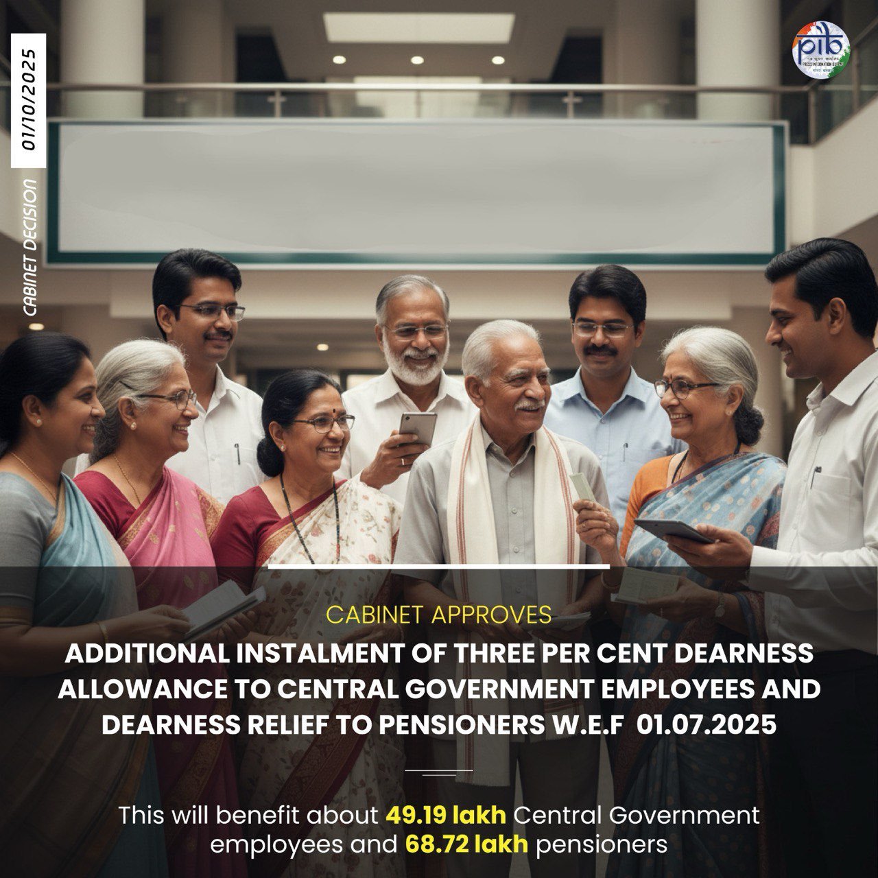 प्रधानमंत्री नरेन्द्र मोदी की अध्यक्षता में आज केंद्रीय मंत्रिमंडल ने केंद्र सरकार के कर्मचारियों को महंगाई भत्ते (डीए) और पेंशनभोगियों को महंगाई राहत (डीआर) की एक अतिरिक्त किस्त जारी करने की स्वीकृति दी, जो 01 जुलाई, 2025 से प्रभावी माना जाएगा।
