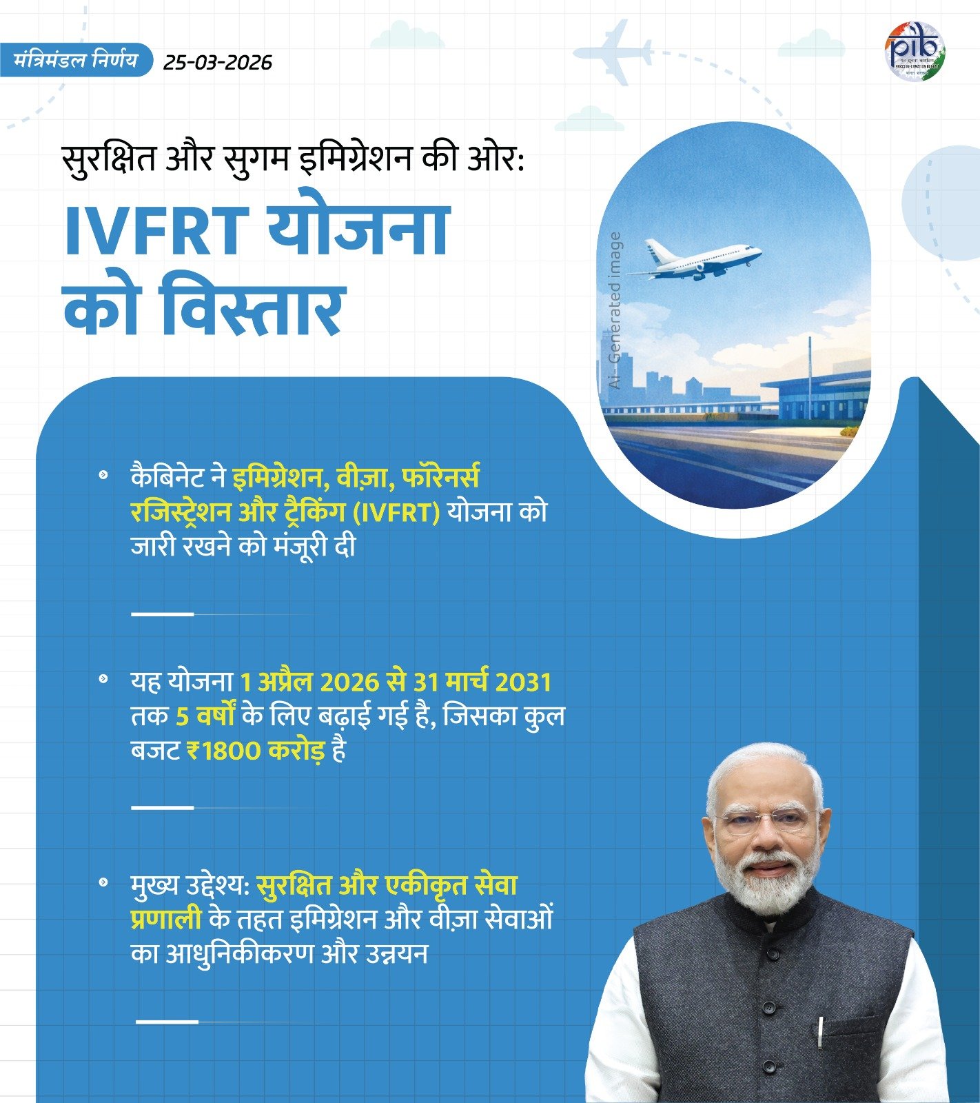 केंद्रीय मंत्रिमंडल ने 1800 करोड़ रुपये के बजट परिव्यय के साथ आव्रजन, वीजा, विदेशी पंजीकरण और ट्रैकिंग (आईवीएफआरटी) योजना को 31 मार्च, 2026 के बाद भी पांच साल की अवधि के लिए 1 अप्रैल, 2026 से 31 मार्च, 2031 तक जारी रखने की मंजूरी दे दी है।