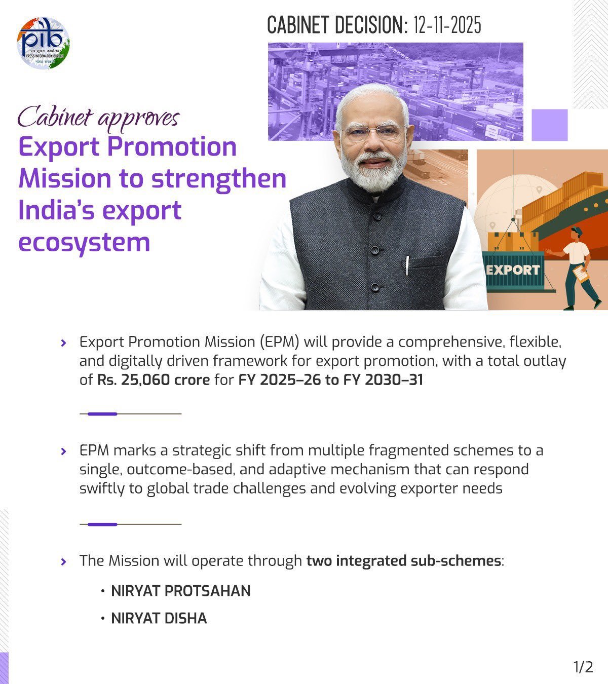 प्रधानमंत्री श्री नरेन्द्र मोदी की अध्यक्षता में केंद्रीय मंत्रिमंडल ने भारत की निर्यात प्रतिस्पर्धा – विशेष रूप से एमएसएमई, पहली बार निर्यात करने वाले और श्रम-प्रधान सेक्टरों को – सुदृढ़ बनाने के लिए केंद्रीय बजट 2025-26 में घोषित एक प्रमुख पहल निर्यात संवर्धन मिशन (ईपीएम) को मंज़ूरी दे दी है।