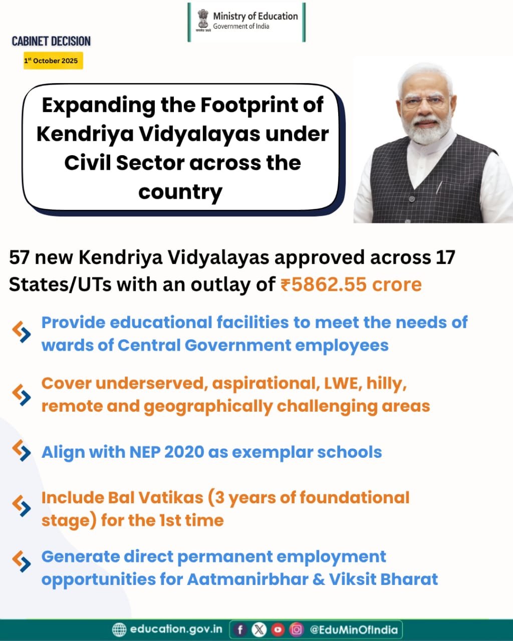 प्रधानमंत्री नरेन्द्र मोदी की अध्यक्षता में आर्थिक मामलों की मंत्रिमंडल समिति ने केंद्र सरकार के कर्मचारियों के बच्चों की बढ़ती संख्या को देखते हुए उनके बच्चों की शैक्षिक आवश्यकताओं को पूरा करने के लिए देश भर में सिविल क्षेत्र के अंतर्गत 57 नए केंद्रीय विद्यालय (केवी) खोलने को मंजूरी दे दी है। 57 नए केंद्रीय विद्यालयों की स्थापना के लिए निधियों की कुल अनुमानित आवश्यकता 5862.55 करोड़ रुपये (लगभग) है, जो 2026-27 से नौ वर्षों की अवधि को कवर करती है। इसमें 2585.52 करोड़ रुपये (लगभग) का पूंजीगत व्यय और 3277.03 करोड़ रुपये (लगभग) का परिचालन व्यय शामिल है। उल्लेखनीय है कि पहली बार इन 57 केंद्रीय विद्यालयों को बाल वाटिका, यानी बुनियादी चरण (प्री-प्राइमरी) के 3 वर्षों के साथ मंजूरी दी गई है।