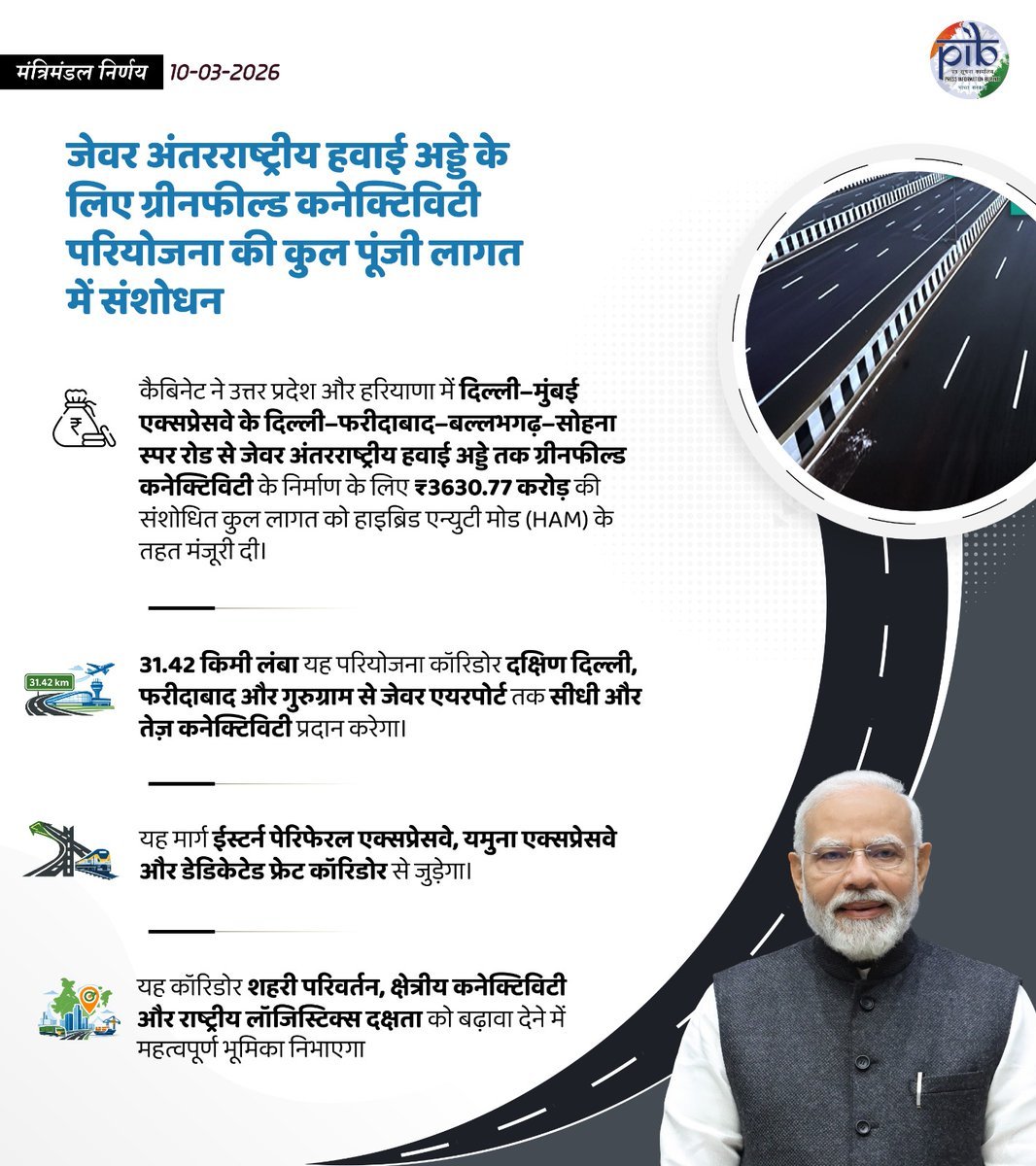 प्रधानमंत्री नरेंद्र मोदी की अध्यक्षता में केंद्रीय मंत्रिमंडल की आर्थिक मामलों की समिति ने आज उत्तर प्रदेश और हरियाणा में हाइब्रिड वार्षिकी आधार पर दिल्ली-मुंबई एक्सप्रेसवे के दिल्ली-फरीदाबाद-बल्लभगढ़-सोहना उपमार्ग से जेवर अंतरराष्ट्रीय हवाई अड्डे तक नए सड़क निर्माण के लिए 3630.77 करोड़ रुपये के संशोधित परिव्यय को स्वीकृति दे दी।
