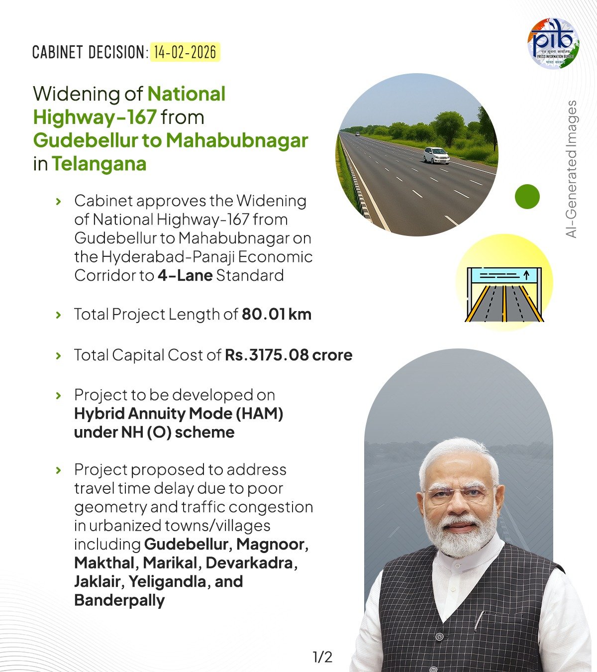 प्रधानमंत्री नरेंद्र मोदी की अध्यक्षता में कल हुई आर्थिक मामलों की मंत्रिमंडलीय समिति ने तेलंगाना राज्य में हैदराबाद–पणजी आर्थिक गलियारे पर गुडबेल्लुर से महबूबनगर तक राष्ट्रीय राजमार्ग-167 के खंड को 4-लेन मानक में विस्तारित करने को मंजूरी दे दी है। इस परियोजना की कुल लंबाई 80.01 किलोमीटर है तथा इसकी कुल पूंजीगत लागत 3,175.08 करोड़ रुपये है। यह परियोजना राष्ट्रीय राजमार्ग (अन्य) योजना के अंतर्गत हाइब्रिड एन्युटी मोड (एच ए एम) पर क्रियान्वित की जाएगी।