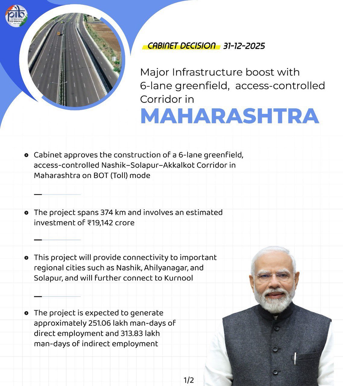 प्रधानमंत्री नरेन्द्र मोदी की अध्यक्षता में आर्थिक मामलों की मंत्रिमंडलीय समिति ने आज महाराष्ट्र में बीओटी मोड पर 374 किलोमीटर लंबी और 19,142 करोड़ रुपये की कुल लागत से निर्मित होने वाली छह लेन की ग्रीनफील्ड एक्सेस-कंट्रोल्ड नासिक-सोलापुर-अक्कलकोट कॉरिडोर के निर्माण को मंजूरी दे दी है। यह परियोजना नासिक, अहिल्यानगर और सोलापुर जैसे महत्वपूर्ण क्षेत्रीय शहरों को कुरनूल से जोड़ेगी, जैसा कि मानचित्र में दर्शाया गया है। यह बुनियादी ढांचा परियोजना प्रधानमंत्री गतिशक्ति राष्ट्रीय मास्टर प्लान सिद्धांत के तहत एकीकृत परिवहन अवसंरचना विकास को बढ़ावा देने की दिशा में एक महत्वपूर्ण कदम है।