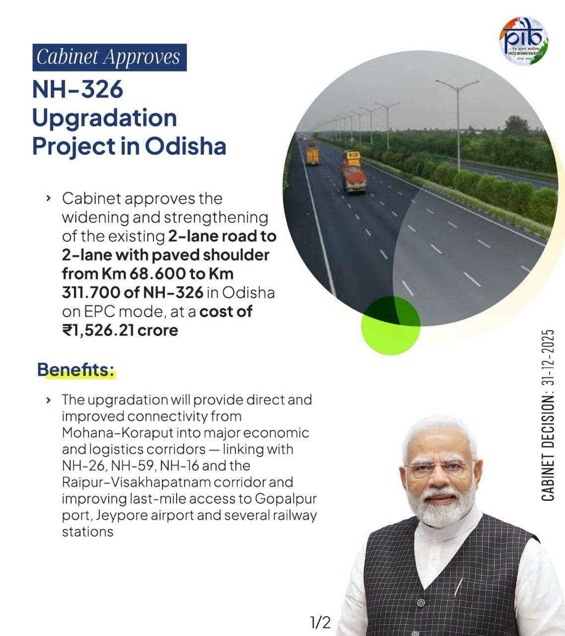 प्रधानमंत्री नरेन्द्र मोदी की अध्यक्षता में केंद्रीय मंत्रिमंडल ने आज ओडिशा राज्य में एनएच-326 के 68,600 किलोमीटर से 311,700 किलोमीटर तक मौजूदा 2-लेन को पेव्ड शोल्डर (सड़क के किनारे बनी पक्की, समतल पट्टी) सहित 2-लेन में बदलने और मजबूत करने को एनएच(ओ) के तहत ईपीसी मोड (इंजीनियरिंग, प्रोक्योरमेंट और कंस्ट्रक्शन परियोजना वितरण पद्धति) की मंजूरी दी।