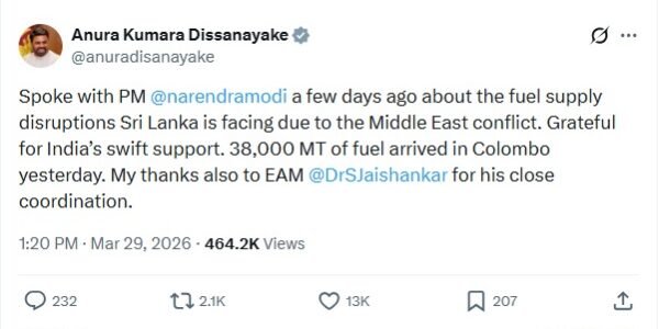 श्रीलंका के राष्ट्रपति अनुरा कुमारा दिसानायके ने पश्चिम एशिया संकट के बीच देश को ईंधन भेजने में भारत के सहयोग के लिए आभार व्यक्त किया