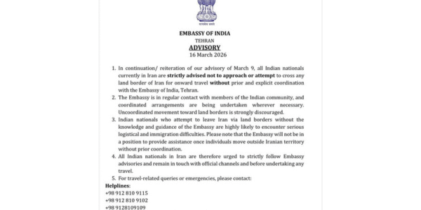 ईरान स्थित भारतीय दूतावास ने ईरान में रह रहे भारतीय नागरिकों को कड़ी सलाह दी है कि वे तेहरान स्थित भारतीय दूतावास से पूर्व और स्पष्ट समन्वय के बिना आगे की यात्रा के लिए ईरान की किसी भी सीमा को…