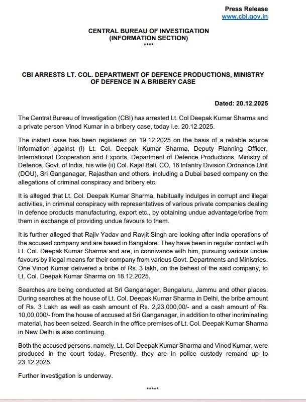 रक्षा मंत्रालय के वरिष्ठ अधिकारियों ने कहा: यह कार्रवाई भारत सरकार की ‘भ्रष्टाचार के प्रति ज़ीरो टॉलरेंस’ की घोषित नीति के तहत की गई है। अधिकारी की गिरफ्तारी कानूनी और संस्थागत ढांचों के माध्यम से भ्रष्टाचार पर अंकुश लगाने के प्रति सरकार के सक्रिय दृष्टिकोण को दर्शाती है।