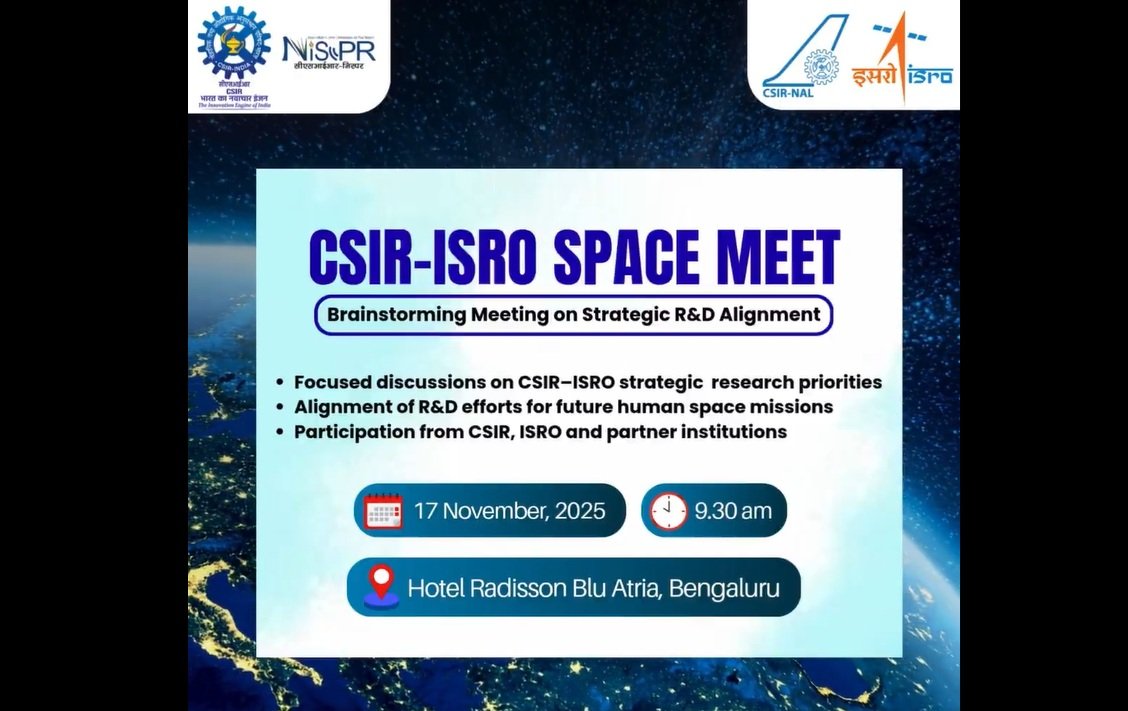 वैज्ञानिक एवं औद्योगिक अनुसंधान परिषद (सीएसआईआर) और भारतीय अंतरिक्ष अनुसंधान संगठन (इसरो) संयुक्त रूप से 17 नवंबर 2025 को बेंगलुरु के होटल रेडिसन ब्लू अटरिया में सीएसआईआर-इसरो स्पेस मीट 2025 का आयोजन करेंगे। इस आयोजन का उद्देश्य मानव अंतरिक्ष उड़ान अनुसंधान, सूक्ष्म गुरुत्वाकर्षण अध्ययन और अंतरिक्ष प्रौद्योगिकी नवाचारों को आगे बढ़ाने में भारत के प्रमुख वैज्ञानिक और अंतरिक्ष संस्थानों के बीच सहयोग को मजबूत करना है, जो अंतरिक्ष अन्वेषण में आत्मनिर्भरता के भारत के दृष्टिकोण के अनुरूप हों।