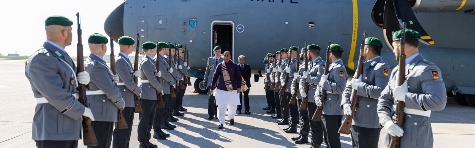 रक्षा मंत्री राजनाथ सिंह तीन दिन की जर्मनी यात्रा पर आज म्यूनिख पहुंचे। इसके बाद वे बर्लिन गए हैं। सोशल मीडिया पर एक पोस्ट में उन्होंने बताया कि उन्हें जर्मन वायुसेना के विशेष विमान से म्यूनिख से बर्लिन लाया गया और लड़ाकू विमानों ने उनकी सुरक्षा की। बर्लिन पहुंचने पर उन्हें सैन्य सम्मान दिया गया।