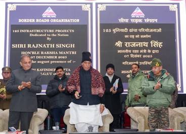 रक्षा मंत्री राजनाथ सिंह ने 7 दिसंबर, 2025 को सीमा सड़क संगठन (बीआरओ) की 125 रणनीतिक रूप से महत्वपूर्ण बुनियादी ढांचा परियोजनाओं को राष्ट्र को समर्पित किया – जो लद्दाख से एक साथ उद्घाटन की गई अब तक की सबसे बड़ी संख्या है। 2 केंद्र शासित प्रदेशों – लद्दाख और जम्मू-कश्मीर तथा 7 राज्यों – अरुणाचल प्रदेश, सिक्किम, हिमाचल प्रदेश, उत्तराखंड, राजस्थान, पश्चिम बंगाल और मिजोरम – में फैली ये परियोजनाएं – 28 सड़कें, 93 पुल और 4 विविध – लगभग 5,000 करोड़ रुपये की लागत से पूरी हुई हैं, जो बीआरओ के इतिहास में सबसे अधिक लागत वाली उद्घाटन परियोजनाएं हैं।
