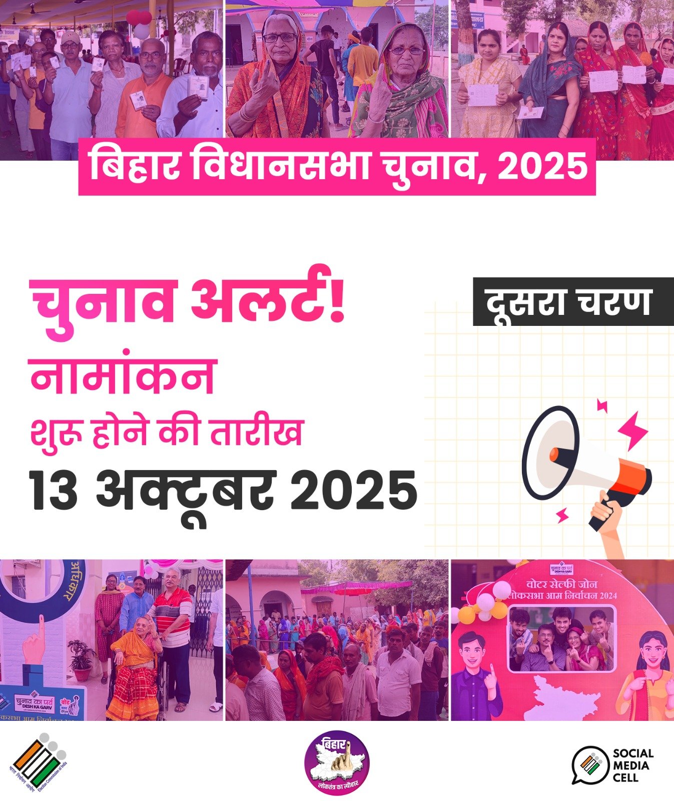 बिहार विधानसभा चुनाव के दूसरे चरण की अधिसूचना जारी होने के साथ ही 20 जिलों के 122 निर्वाचन क्षेत्रों के लिए नामांकन प्रक्रिया शुरू हो जाएगी। 20 अक्तूबर तक नामांकन भरे जा सकते हैं, इनकी जांच 21 अक्तूबर को होगी।