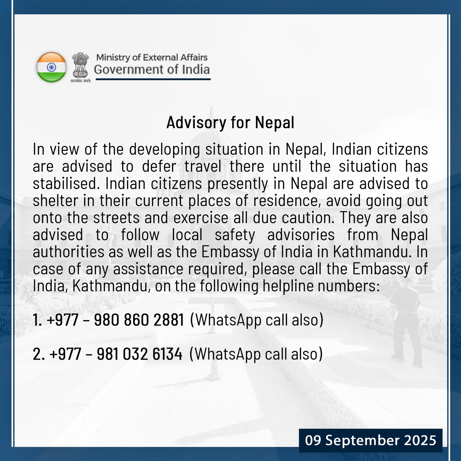 सरकार ने भारतीय नागरिकों को स्थिति सामान्य होने तक नेपाल की यात्रा न करने की सलाह दी है। सरकार ने नेपाल में भारतीय नागरिकों को अपने वर्तमान निवास स्थानों पर ही रहने, सड़कों पर जाने से बचने और पूरी सावधानी बरतने की सलाह दी है। साथ ही, नेपाल के अधिकारियों और काठमांडू स्थित भारतीय दूतावास द्वारा जारी स्थानीय सुरक्षा सलाह का पालन करने की भी सलाह दी है। सरकार ने काठमांडू स्थित भारतीय दूतावास के हेल्पलाइन नंबर जारी किए हैं। नंबर हैं +977 – 980 860 2881 और +977 – 981 032 6134। नंबर एक बार फिर सुन लें- नंबर हैं +977 – 980 860 2881 और +977 – 981 032 6134। किसी भी सहायता के लिए इन नंबरों पर संपर्क किया जा सकता है।