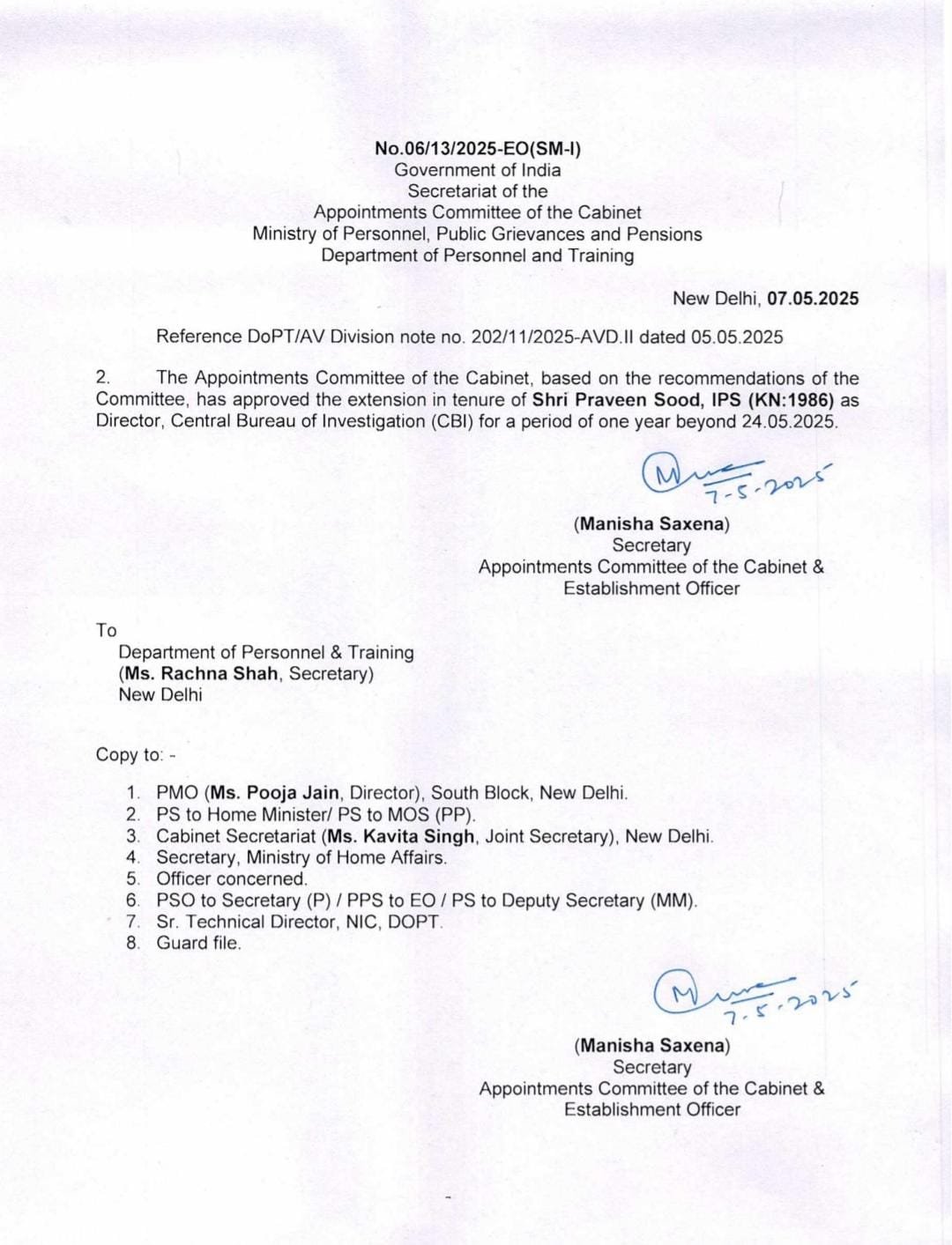 सरकार ने केन्द्रीय अन्वेषण ब्यूरो (CBI) के निदेशक प्रवीण सूद का कार्यकाल इस महीने की 24 तारीख से एक साल के लिए बढ़ा दिया है। कैबिनेट की नियुक्ति समिति ने प्रवीण सूद के कार्यकाल को एक साल के लिए बढ़ाने को मंजूरी दे दी है। प्रवीण सूद कर्नाटक कैडर के आईपीएस अधिकारी हैं और उन्हें इस महीने की 25 तारीख को सेवानिवृत्त होना था।