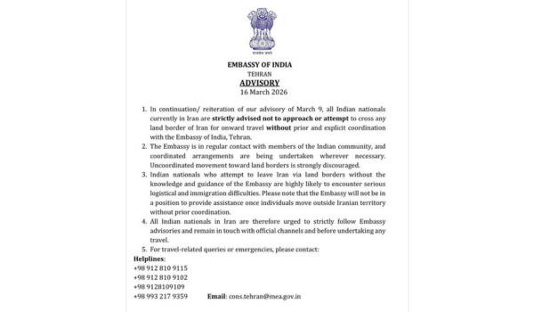 ईरान स्थित भारतीय दूतावास ने ईरान में रह रहे भारतीय नागरिकों को कड़ी सलाह दी है कि वे तेहरान स्थित भारतीय दूतावास से पूर्व और स्पष्ट समन्वय के बिना आगे की यात्रा के लिए ईरान की किसी भी सीमा को पार करने का प्रयास न करें। दूतावास ने कहा है कि उनकी जानकारी और मार्गदर्शन के बिना सीमाओं के माध्यम से ईरान छोड़ने का प्रयास करने वाले भारतीय नागरिकों को गंभीर रसद और आव्रजन संबंधी कठिनाइयों का सामना करना पड़ सकता है।