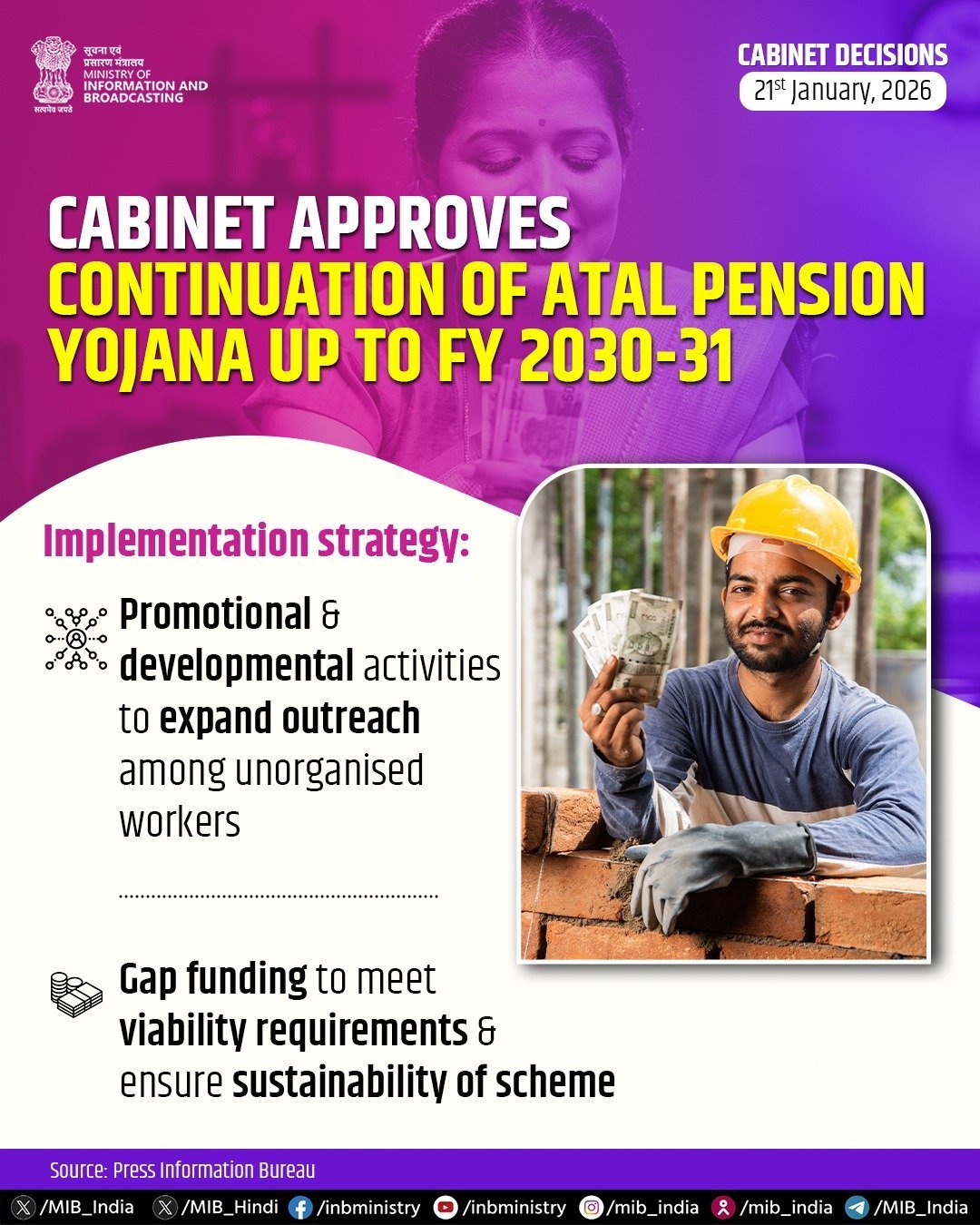 मंत्रिमंडल ने आज अटल पेंशन योजना को 2030-31 तक जारी रखने के साथ ही प्रचार और विकासात्मक गतिविधियों के लिए वित्तीय सहायता बढ़ाने को मंजूरी दे दी है। इस योजना के अंतर्गत अब तक आठ करोड़ 66 लाख से अधिक लाभार्थी पंजीकृत हो चुके हैं।