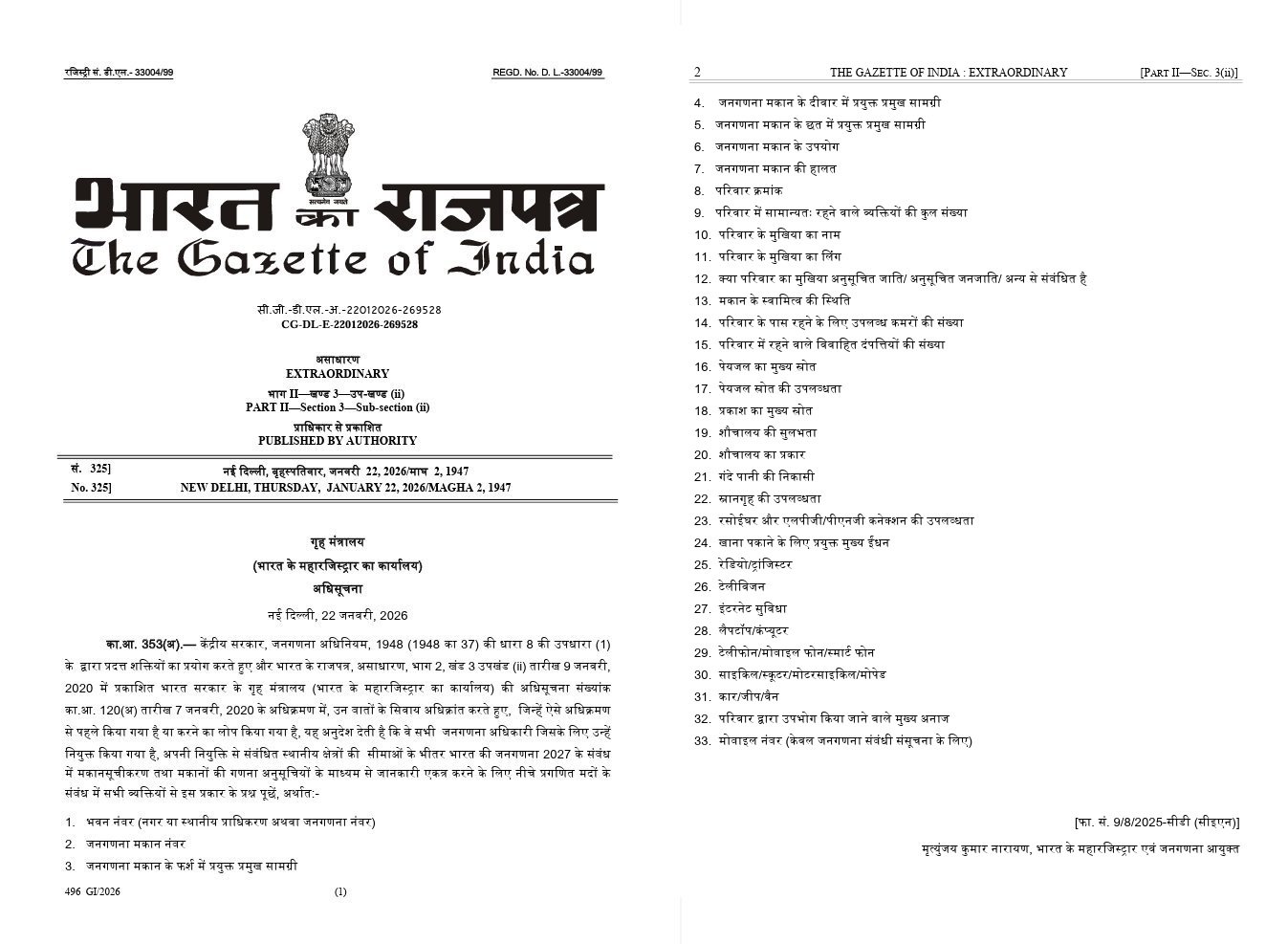 सर्वेक्षण के दौरान जनगणना अधिकारी घर के स्वामित्व की स्थिति, घर के उपयोग, कमरों की संख्या तथा परिवार के मुखिया के लिंग के बारे में जानकारी मांगेंगे। नागरिकों से उनके घरों में उपलब्ध बुनियादी सुविधाओं के बारे में भी पूछा जाएगा। इनमें लोगों से पीने के पानी का मुख्य स्रोत, रोशनी का मुख्य स्रोत, शौचालय की उपलब्धता तथा प्रकार, अपशिष्ट जल निकासी, स्नान सुविधा और रसोई की उपलब्धता, एलपीजी और पीएनजी कनेक्शन तथा खाना पकाने के लिए उपयोग किया जाने वाले ईंधन के बारे में भी जानकारी एकत्र की जाएगी। नागरिकों के पास 30 दिनों के गृह सूचीकरण अभियान शुरू होने से ठीक पहले 15 दिनों की अवधि में स्व-गणना करने का विकल्प भी उपलब्ध होगा। जनगणना दो चरणों में आयोजित की जाएगी। अप्रैल से सितंबर तक घरों का सूचीकरण और आवास जनगणना तथा फरवरी 2027 में व्यक्तियों की गणना होगी।