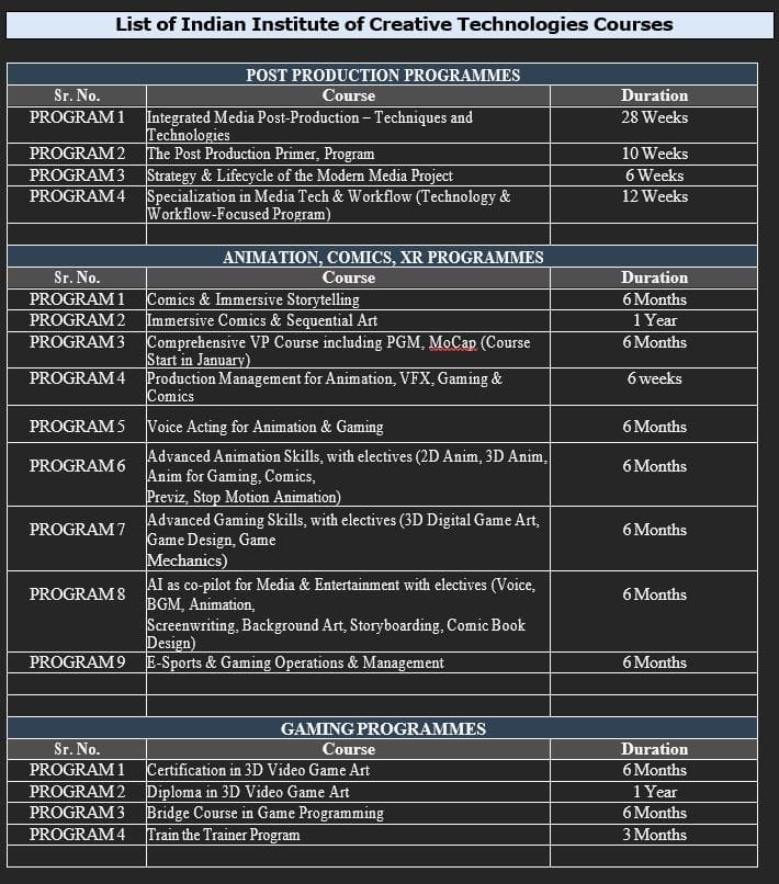 भारतीय रचनात्मक प्रौद्योगिकी संस्थान के मुख्य कार्यकारी अधिकारी, डॉ. विश्वास देउस्कर ने कहा कि उनका विज़न विश्वस्तरीय प्रतिभाओं को पोषित करके एवीजीसी-एक्सआर क्षेत्र में भारत को एक वैश्विक महाशक्ति बनाना है। पाठ्यक्रम भारत की गतिशील रचनात्मक क्षमता पर आधारित होते हुए भी वैश्विक मानकों को पूरा करने के लिए तैयार किए गए हैं। विस्तृत पाठ्यक्रम की घोषणा इस महीने के अंत में होने की आशा है।