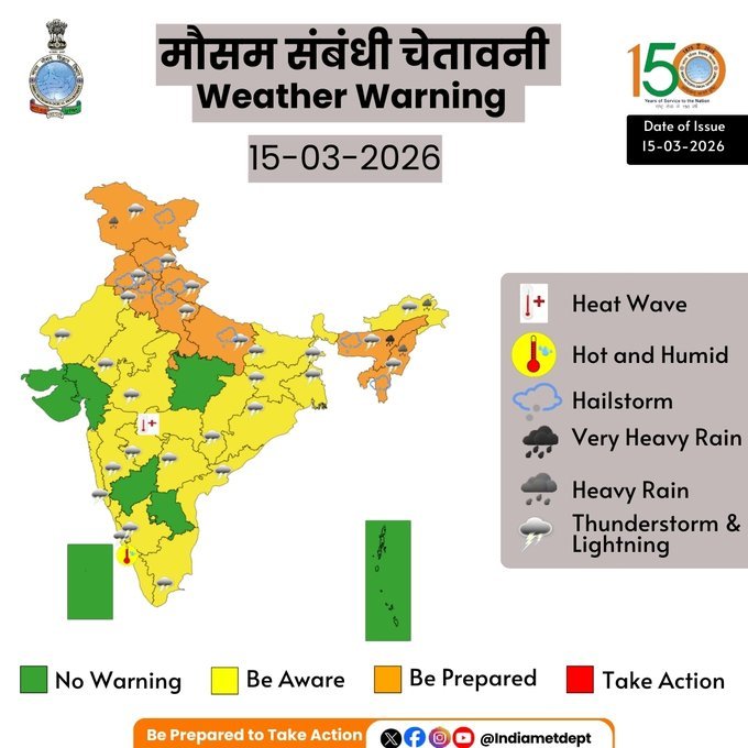 मौसम विभाग ने दिल्ली, चंडीगढ़, हरियाणा, पंजाब, उत्तर प्रदेश, उत्तराखंड और जम्मू-कश्मीर में कल तक ओलावृष्टि और गरज-चमक के साथ तूफान का ऑरेंज अलर्ट जारी किया है। अरुणाचल प्रदेश, असम और मेघालय में भी कल तक कुछ स्थानों पर तेज वर्षा की संभावना व्यक्त की गई है। वहीं, जम्मू-कश्मीर, लद्दाख, हिमाचल प्रदेश और उत्तराखंड में बृहस्पतिवार तक बिजली कड़कने, तेज हवा चलने और गरज-चमक के साथ तूफान की आशंका है।