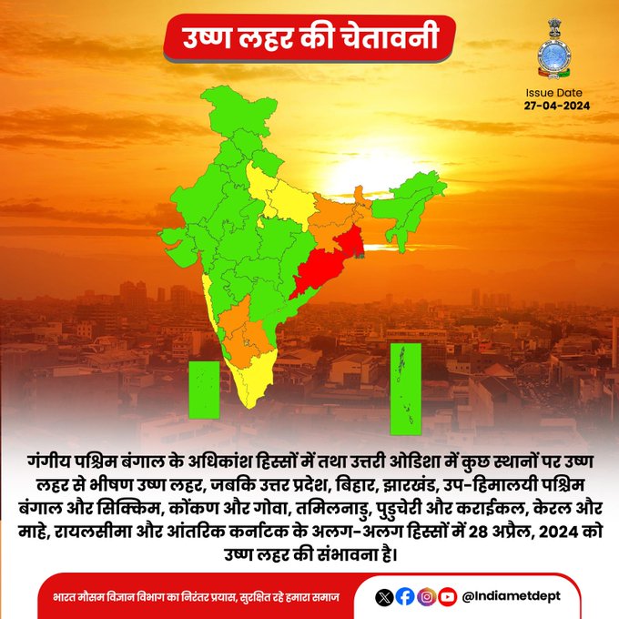 जो हीटवेव का कन्डीशन है, वो मेनली बंगाल का जो गैंगटिक वैस्ट बंगाल है और ओडिशा है, उसके लिए रेड कलर वार्निंग, हीटवेव टू सीवियर हीटवेव ओवर ओडिशा और जीडब्ल्यूवी के लिए किया गया है। और ये 28 से लेकर के 30 तक रहेगा। हमारे पास जो तापमान मिला है वो 41 से 44 वहां रिकॉर्ड हो रहा है। 15 अप्रैल ओडिशा से ये हीटवेव शुरू हुआ और जो गैंगटिक वैस्ट बंगाल है वो 17 अप्रैल से शुरू हुआ है। तो इसकी वजह से बहुत ज्यादा इम्पैक्ट होने का उम्मीद है। इसको छोड़कर झारखंड, बिहार, आन्ध्र प्रदेश, तेलंगाना ये सब इलाकों में भी हीटवेव ऑरेंज कलर हम लोग तीन से चार दिन तक जारी किया है।