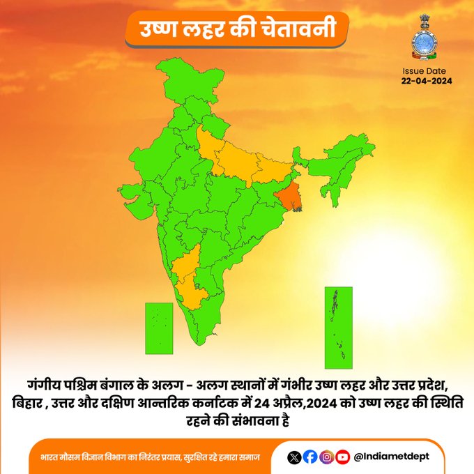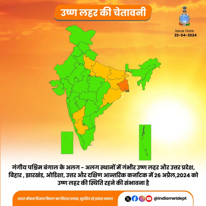 मौसम विभाग (IMD) के अनुसार अगले पांच दिनों तक देश के पूर्वी हिस्से में लू का प्रकोप जारी रहेगा। बुधवार से इसका दायरा और बढने की संभावना है। पश्चिम बंगाल के गांगेय क्षेत्र के अलग-अलग हिस्सों में भी लू चलने की संभावना है। मौसम विभाग (IMD) ने भीतरी कर्नाटक, ओडिसा, पूर्वी उत्तर प्रदेश, पश्चिमी उत्तर प्रदेश, बिहार और झारखंड के अलग-अलग हिस्सों में भी तेज गर्मी पडने की आशंका जताई है।