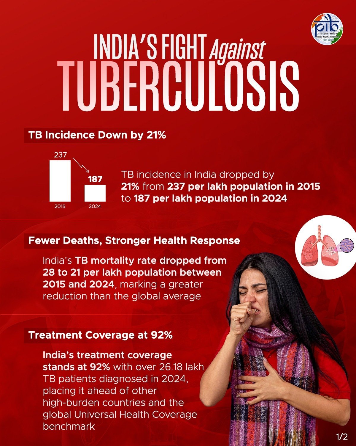 भारत ने टीबी की वजह से होनी वाली मृत्यु दर में कमी हासिल की है। यह दर वर्ष 2015 में प्रति लाख आबादी पर 28 थी जो घटकर वर्ष 2024 में प्रति लाख आबादी पर 21 हो गई। नई दिल्ली में संसद भवन एनेक्सी सभागार में टीबी मुक्त भारत अभियान पर सांसदों को संबोधित करते हुए, स्वास्थ्य मंत्री जगत प्रकाश नड्डा ने टीबी उन्मूलन के लक्ष्य को हासिल करने में सांसदों की महत्वपूर्ण भूमिका का उल्लेख किया।