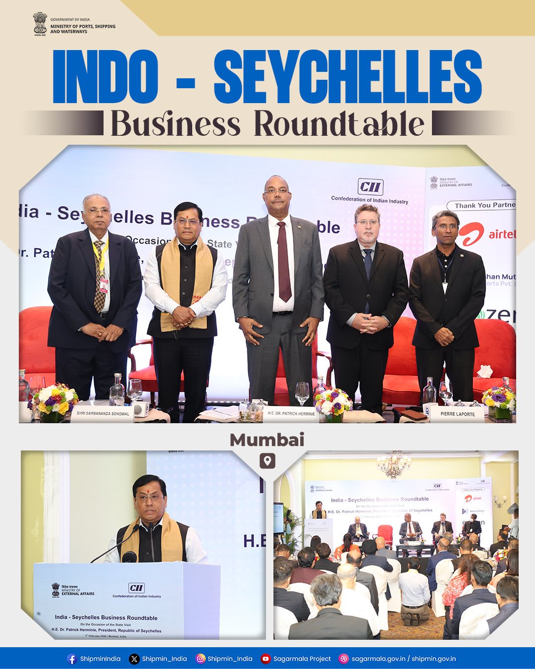 भारत और सेशेल्स ने मुंबई में आयोजित भारत-सेशेल्स व्यवसाय गोलमेज वार्ता में समुद्री व्यापार, ब्लू इकोनॉमी क्षेत्रों और सतत विकास में सहयोग को गहरा करने के अवसरों पर चर्चा की। इसमें सेशेल्स गणराज्य के राष्ट्रपति महामहिम डॉ. पैट्रिक हर्मिनी और बंदरगाह, जहाजरानी और जलमार्ग मंत्री सर्बानंद सोनोवाल ने भाग लिया।
