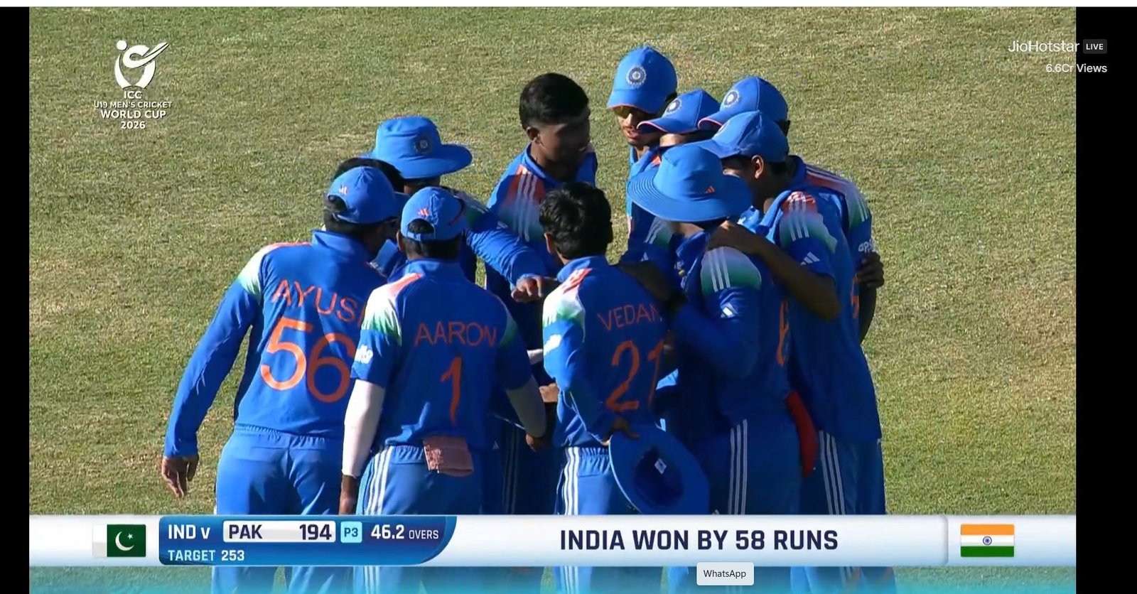 आईसीसी पुरुष अंडर-19 एकदिवसीय विश्व कप क्रिकेट में कल भारत ने जिम्बाब्वे में पाकिस्तान को 58 रन से हराकर सेमीफाइनल में प्रवेश कर लिया। 253 रनों के लक्ष्य का पीछा करते हुए पाकिस्तान की टीम 46 ओवर ऑर 2 गेंद में 194 रनों पर सिमट गई। दूसरे सेमीफाइनल में कल ऑस्ट्रेलिया का मुकाबला इंग्लैंड से होगा।