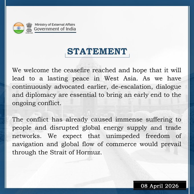 भारत ने अमरीका और ईरान के बीच संघर्ष विराम का स्वागत किया है। विदेश मंत्रालय ने एक बयान में विश्वास व्यक्त की कि इससे पश्चिम एशिया में स्थायी शांति स्थापित होगी और होर्मुज जलडमरूमध्य से होकर निर्बाध नौवहन और वैश्विक व्यापार जारी रहेगा। मंत्रालय ने कहा कि भारत ने निरंतर तनाव कम करने, संवाद और कूटनीति का समर्थन किया है, जो मौजूदा संघर्ष को जल्द समाप्त करने के लिए आवश्यक हैं। मंत्रालय ने कहा कि इस संघर्ष ने पहले ही लोगों को परेशानी हुई है और इससे वैश्विक ऊर्जा आपूर्ति और व्यापार नेटवर्क को बाधित हुआ है।