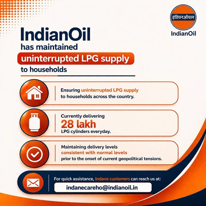 पश्चिमी एशिया संघर्ष के वैश्विक ऊर्जा बाजारों पर प्रभाव के बावजूद भारत में एलपीजी की आपूर्ति पर्याप्त बनी हुई है। इंडियन ऑयल ने कहा है कि उसने रसोई गैस की निर्बाध आपूर्ति बनाए रखी है और वर्तमान में प्रतिदिन लगभग 28 लाख एलपीजी सिलेंडर वितरित कर रही है। यह वितरण मौजूदा भू-राजनीतिक तनावों के शुरू होने से पहले के सामान्य स्तरों के अनुरूप है। कंपनी ने ग्राहकों को एलपीजी रिफिल बुक करने के लिए एस.एम.एस और आई.वी.आर.एस जैसे डिजिटल माध्यमों का उपयोग करने के लिए प्रोत्साहित किया है।