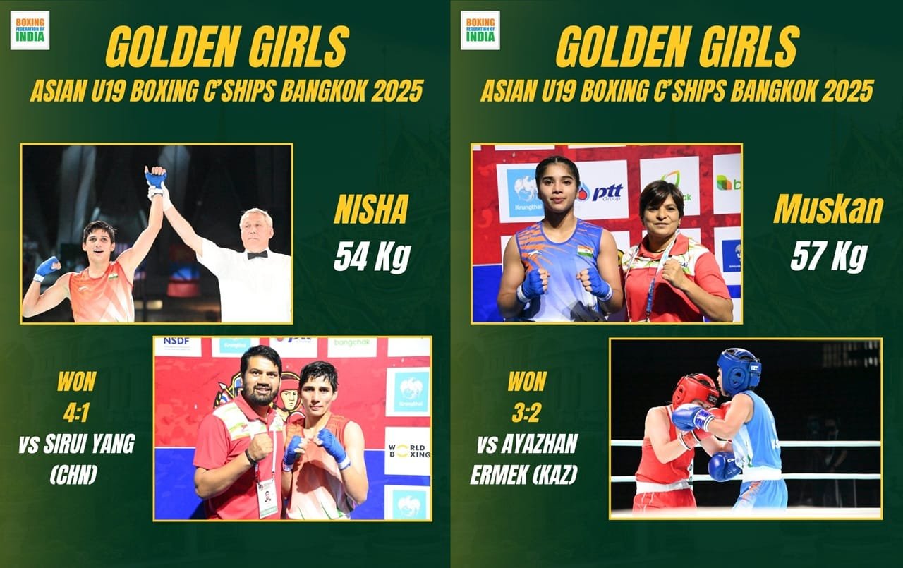 एशियाई अंडर-19 मुक्केबाजी चैंपियनशिप में कल भारत की लड़कियों ने दो स्वर्णपदक जीते। निशा ने 54 किलोग्राम और मुस्कान ने 57 किलोग्राम भार वर्ग में स्वर्ण पदक जीता। लड़कों के वर्ग में राहुल कुंडू ने 75 किलोग्राम भार वर्ग में स्वर्ण जीता। चैंपियनशिप में तीन स्वर्ण, सात रजत और चार कांस्य सहित भारत के कुल 14 पदक हो गए हैं। इनमें से 9 पदक लड़कियों ने जीते हैं।