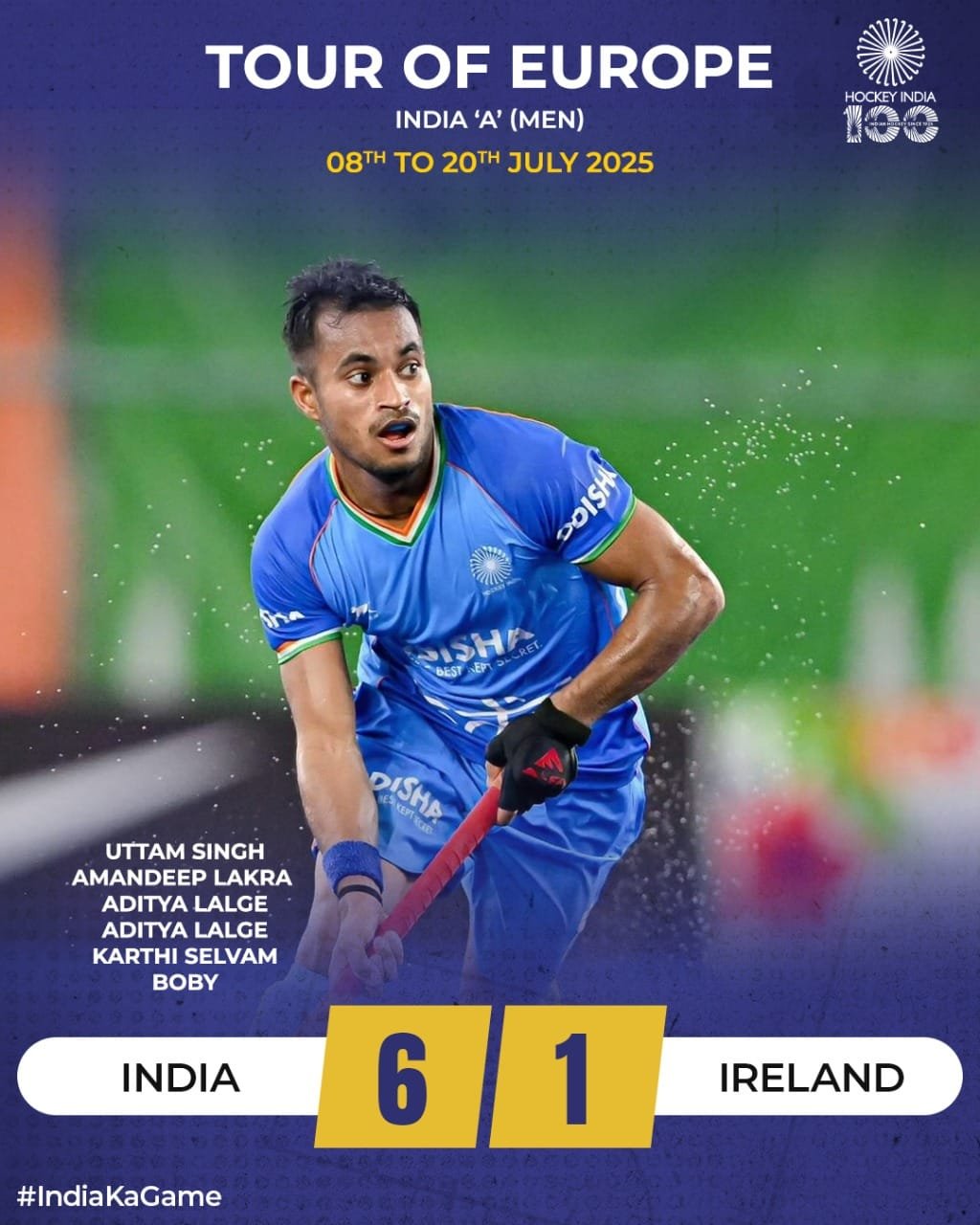 नीदरलैंड्स में, भारत-ए पुरुष हॉकी टीम ने आयरलैंड पर 6-1 से शानदार जीत के साथ अपने यूरोप दौरे की शुरुआत की। मुकाबले में आयरलैंड केवल एक गोल ही कर सका। प्रतियोगिता में आज भारतीय टीम का मुकाबला आयरलैंड से होगा। मैच भारतीय समयानुसार साढे 9 बजे से खेला जाएगा।