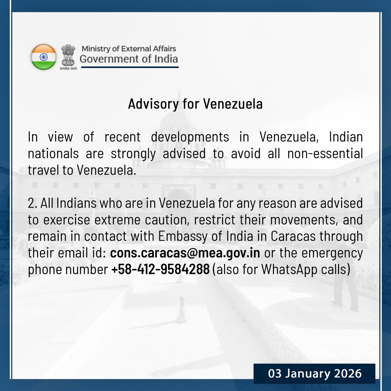 विदेश मंत्रालय ने हालिया घटनाक्रमों को देखते हुए भारतीय नागरिकों से वेनेजुएला की सभी गैर-जरूरी यात्राओं से बचने की सलाह जारी की है। वेनेजुएला में किसी भी कारण से मौजूद सभी भारतीयों को अत्यधिक सावधानी बरतने, अपनी गतिविधियों को सीमित करने और कराकस स्थित भारतीय दूतावास के संपर्क में रहने की सलाह दी गई है। दूतावास का ईमेल cons.caracas@mea.gov.in है और आपातकालीन फोन नंबर +58-412-9584288 है।