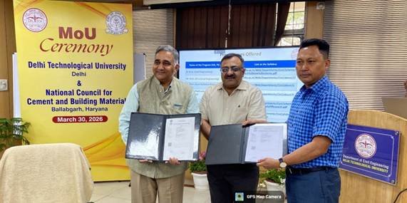 नेशनल काउंसिल फॉर सीमेंट एंड बिल्डिंग मैटेरियल्स (एनसीबी) ने दिल्ली टेक्नोलॉजिकल यूनिवर्सिटी (डीटीयू) के साथ एक समझौता ज्ञापन (एमओयू) पर हस्ताक्षर किए हैं, जो भारत के सीमेंट और निर्माण क्षेत्र में अनुसंधान-अकादमिक सहयोग को मज़बूत करने की दिशा में एक महत्वपूर्ण कदम है।