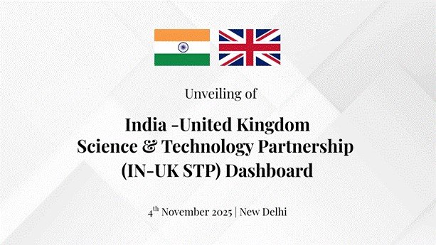 भारत सरकार के प्रधान वैज्ञानिक सलाहकार (पीएसए) प्रोफेसर अजय कुमार सूद और यूनाइटेड किंगडम के राष्ट्रीय प्रौद्योगिकी सलाहकार डॉ. डेविड वॉरेन स्मिथ ने 4 नवंबर 2025 को भारत मंडपम, नई दिल्ली में आयोजित एक द्विपक्षीय बैठक में भारत-यूनाइटेड किंगडम विज्ञान और प्रौद्योगिकी साझेदारी (आईएन-यूके-एसटीपी) डैशबोर्ड के पायलट संस्करण का अनावरण किया। बैठक में पीएसए कार्यालय में वैज्ञानिक सचिव डॉ. परविंदर मैनी और भारतीय विज्ञान एवं प्रौद्योगिकी विभाग, पीएसए कार्यालय, यूके विज्ञान, नवाचार एवं प्रौद्योगिकी विभाग (डीएसआईटी) और भारत में ब्रिटिश उच्चायोग के वरिष्ठ अधिकारी शामिल हुए।