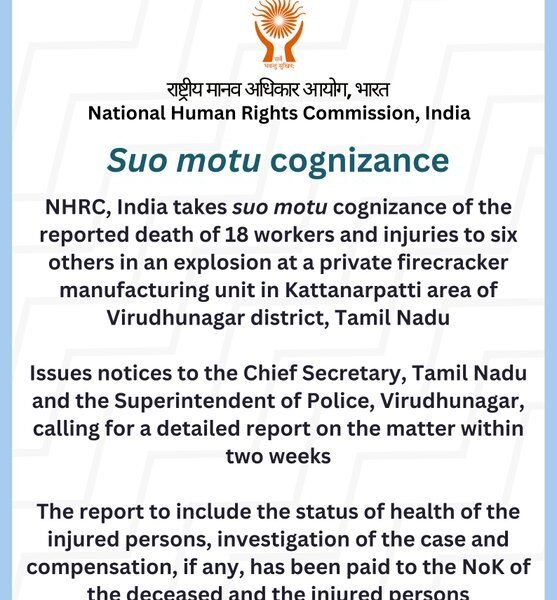 तमिलनाडु में एक निजी पटाखा निर्माण इकाई में हुए विस्फोट में 18 श्रमिकों की मौत और छह अन्य के घायल होने की घटना का NHRC ने स्वतः संज्ञान लिया