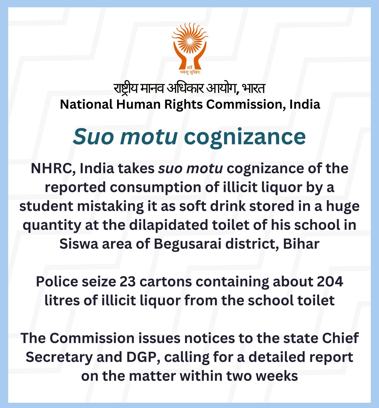 भारत के राष्ट्रीय मानवाधिकार आयोग (एनएचआरसी) ने उन मीडिया रिपोर्टों का स्वतः संज्ञान लिया है जिसमें कहा गया था कि 06 अप्रैल 2026 को बिहार के बेगुसराय जिले के सिसवा क्षेत्र में स्थित एक विद्यालय के जर्जर शौचालय में बोतलों में भरी हुई अवैध शराब को चौथी कक्षा के एक छात्र ने शीतल पेय समझकर गलती से पी ली। वह नशे की हालत में घर लौटा। छात्र के परिवार वालों ने घटना की जानकारी स्कूल के अधिकारियों को दी और मामला पुलिस के संज्ञान में लाया गया। खबरों के अनुसार, पुलिस ने शौचालय से लगभग 204 लीटर अवैध शराब से भरे कुल 23 कार्टन जब्त किए।
