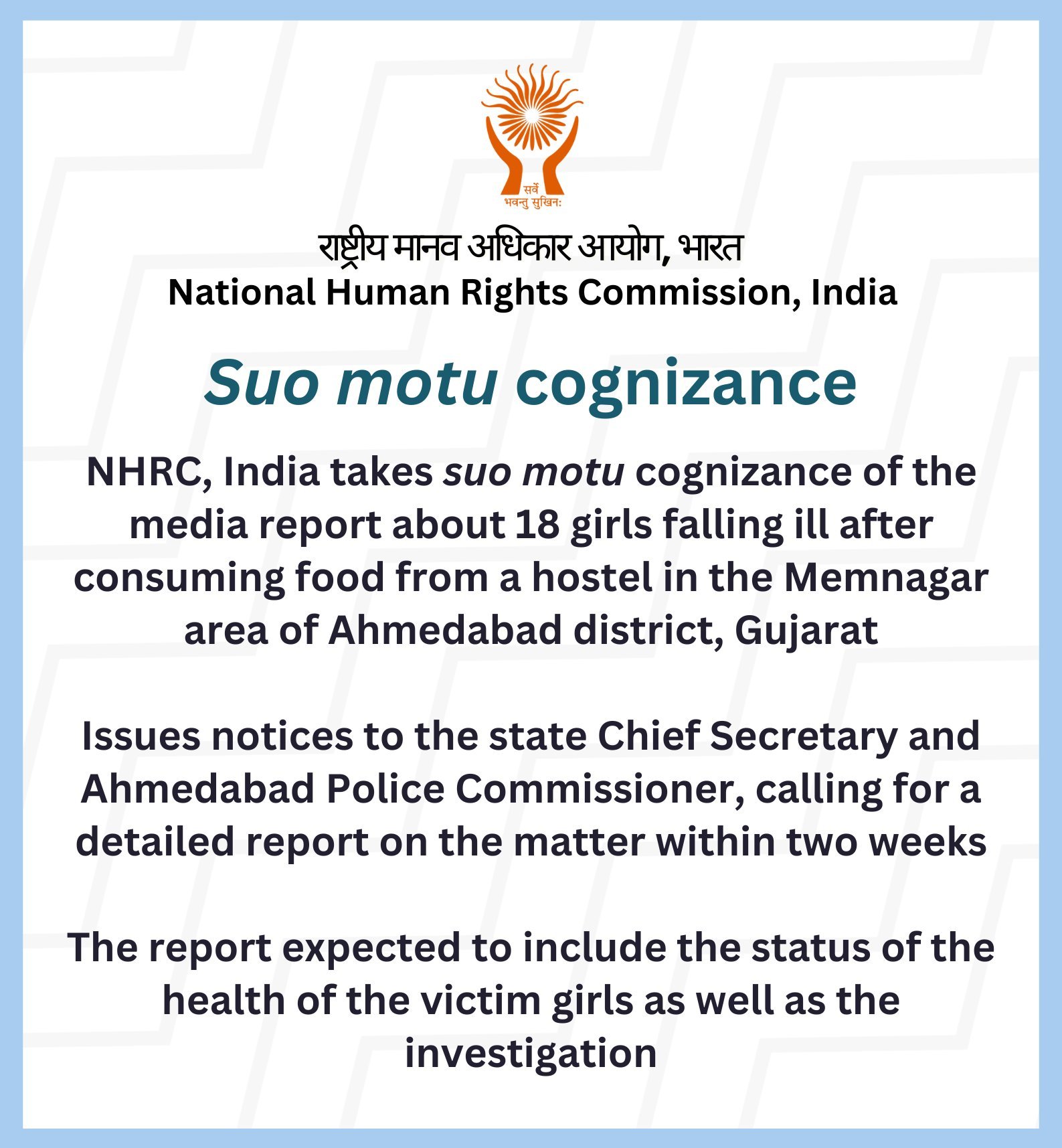 राष्ट्रीय मानवाधिकार आयोग (एनएचआरसी) ने 5 अप्रैल 2026 को गुजरात के अहमदाबाद जिले के मेमनगर क्षेत्र में एक छात्रावास में भोजन करने के बाद लगभग 57 लड़कियों के बीमार पड़ने संबंधी मीडिया रिपोर्ट का स्वतः संज्ञान लिया है। लड़कियों ने पेट दर्द, पेचिश और उल्टी की शिकायत की, जिसके बाद उन्हें उपचार के लिए अस्पताल ले जाया गया।