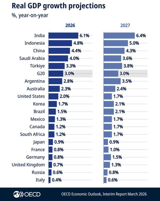आर्थिक सहयोग और विकास संगठन- ओ.ई.सी.डी. ने भारत की सकल घरेलू उत्पाद- जीडीपी वृद्धि दर 2025-26 में सात दशमलव 6 प्रतिशत, 2026-27 में 6 दशमलव एक प्रतिशत और 2027-28 में 6 दशमलव 4 प्रतिशत रहने का अनुमान व्यक्त किया है। इससे भारत, विश्व की सबसे तेजी से बढ़ती प्रमुख अर्थव्यवस्था बना रहेगा। संगठन की अंतरिम आर्थिक आउटलुक रिपोर्ट में कहा गया है कि पश्चिम एशिया में चल रहा संघर्ष वैश्विक अर्थव्यवस्था की मजबूती की परीक्षा ले रहा है। होर्मुज जलडमरूमध्य से माल ढुलाई रुकने और कुछ ऊर्जा अवसंरचनाओं के बंद होने या क्षतिग्रस्त होने से ऊर्जा की कीमतों में उछाल आया है।