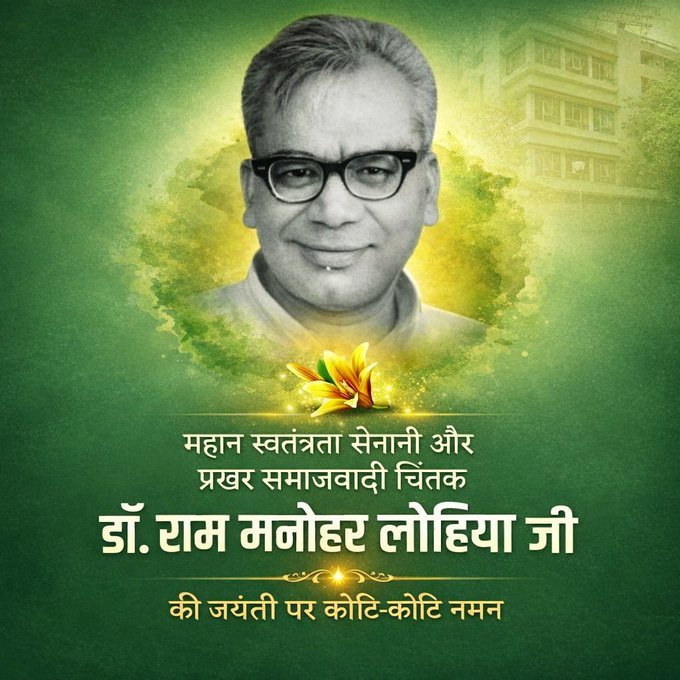 प्रधानमंत्री ने एक्स(X) पर लिखा: “डॉ. राम मनोहर लोहिया जी को उनकी जयंती पर श्रद्धांजलि। वे एक बहुआयामी व्यक्तित्व थे, जिन्होंने औपनिवेशिक शासन के खिलाफ लोगों को संगठित करने में महत्वपूर्ण भूमिका निभाई और इसके बाद वर्ष 1947 के पश्चात भारत की प्रगति में योगदान दिया। वे एक उत्कृष्ट विचारक और सामाजिक न्याय की प्रमुख आवाज़ों में से एक थे। गरीबों और वंचितों को सशक्त बनाने के उद्देश्य के प्रति उनकी अटूट प्रतिबद्धता आज भी कई पीढ़ियों को प्रेरित करती है। लैंगिक समानता और सहभागी शासन पर उनके विचार भी समान रूप से उतने ही उल्लेखनीय हैं।”