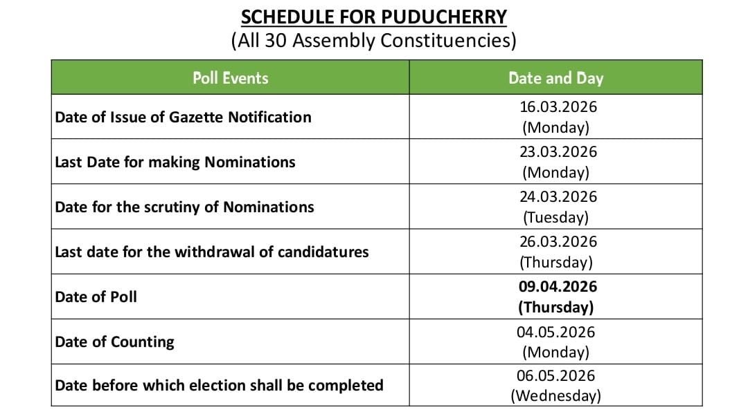 पुद्दुचेरी की 30 विधानसभा सीटों के लिए नामांकन दाखिल करने की प्रक्रिया आज से शुरू होगी। उम्मीदवार आज से 23 मार्च तक नामांकन दाखिल कर सकते हैं। नामांकन ऑनलाइन भी भरे जा सकते हैं, हालांकि इसकी मुद्रित प्रति रिटर्निंग अधिकारी को व्यक्तिगत रूप से जमा करनी होगी। नामांकन पत्रों की जांच 24 मार्च को होगी और नाम वापस लेने की आखिरी तारीख है 26 मार्च। पुद्दुचेरी विधानसभा के लिए मतदान 9 अप्रैल को होगा। मतगणना 4 मई को होगी।