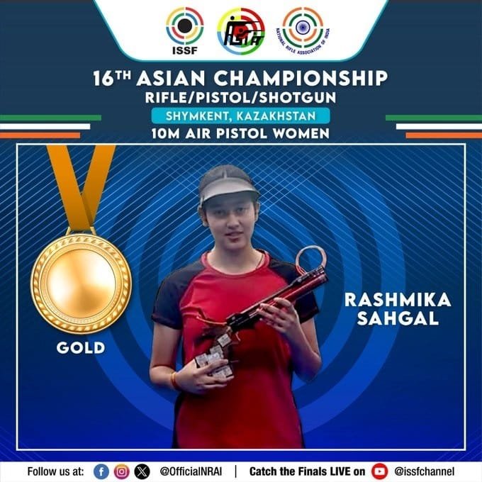 कज़ाख्सतान में 16वीं एशियाई निशानेबाजी प्रतियोगिता के दूसरे दिन कल भारत की रश्मिका सहगल ने स्वर्ण पदक जीता। यह इस प्रतियोगिता की व्यक्तिगत स्पर्धा में भारत का तीसरा स्वर्ण है। इससे पहले, मनु भाकर ने महिलाओं की दस मीटर एयर पिस्टल स्पर्धा के फाइनल में तीसरा स्थान हासिल कर एक और अंतर्राष्ट्रीय पदक भारत के खाते में डाला। रश्मिका ने वंशिका चौधरी और मोहिनी सिंह के साथ मिलकर स्वर्ण पदक जीता। मनु भाकर ने पलक और सुरूचि फोगाट के साथ टीम स्पर्धा में कांस्य अपने नाम किया। प्रतियोगिता में भारत ने अब तक पांच स्वर्ण, दो रजत और चार कांस्य जीते हैं।
